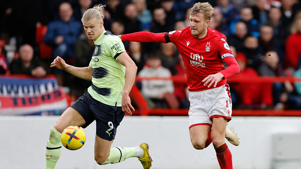 Players of Manchester City and Nottingham Forest in action during a Premier League match in Nottingham, UK, February 18, 2023. /CFP