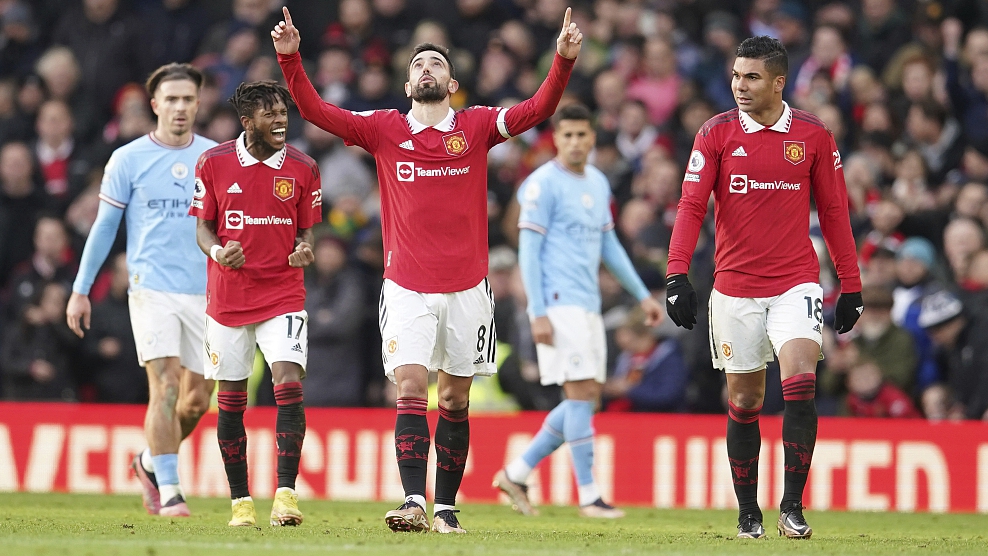 Manchester United's Bruno Fernandes (C) celebrates during their Premier League clash with arch-rivals Manchester City at Old Trafford in Manchester, England, January 14, 2023. /CFP