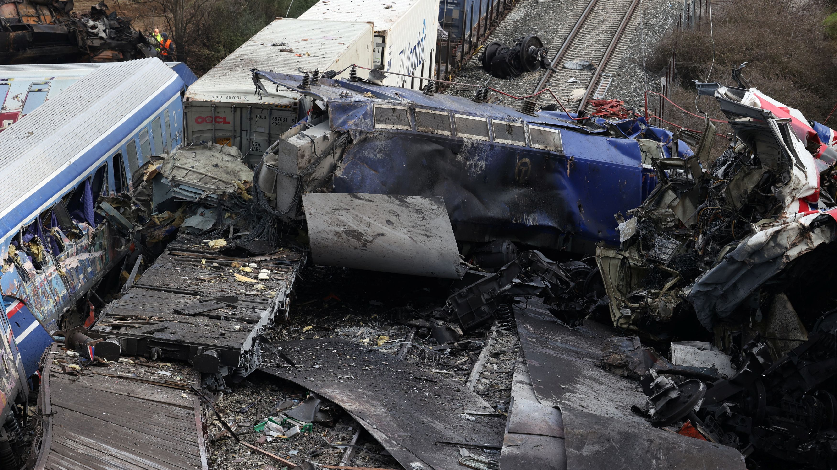 Destroyed train carriages are seen at the site where two trains collided near the city of Larissa, Greece, March 1, 2023. /Reuters