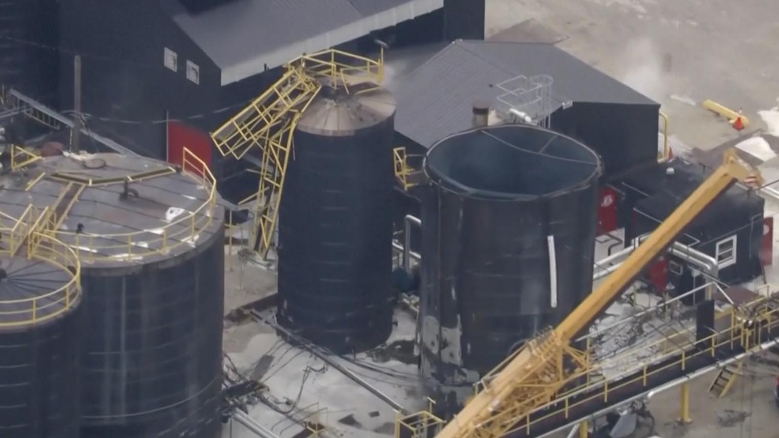 An explosion and fire at a suburban Chicago petroleum refinery killed one person and injured a second Tuesday morning. The sheriff's office says that "initial reports indicate that the explosion may be from an asphalt tank." Television footage of the scene showed damage to several circular tanks at the complex, with large pieces of debris on the ground and yellow railing hanging from more than one tank. Apparent power lines were also visible on top of a damaged pickup truck at the site, which is adjacent to railroad tracks and a roadway.