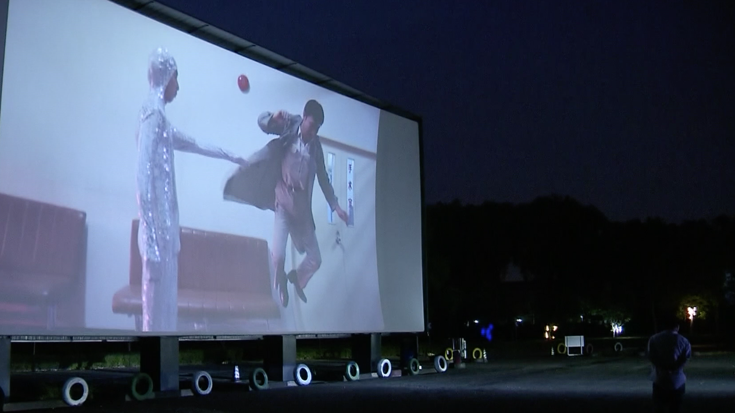 The photograph shows a classic Chinese sci-fi film being screened at a drive-in theater at Shanghai Chenshan Botanical Garden; this forms part of events held during the 25th Shanghai International Film Festival. /CGTN