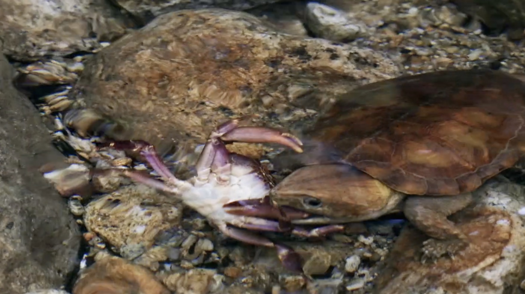 In nature, it's survival of the fittest. Staring death in the face, one has to struggle and fight. This is the ultimate philosophy of life and a lesson to be mastered by all creatures in their days of learning and growing. Northern Guangdong houses majestic mountains and serpentine waters. In the green hills dwells the big-headed turtle, a carefree creature of the clear streams. Freshwater crabs are the focus of its attention. For freshwater crabs, the turtle is a veritable nightmare. Only the quickest reaction and the skill of squeezing into crevices can save it from being devoured. Watch the video to see the intriguing story of the big-headed turtle and the freshwater crab!