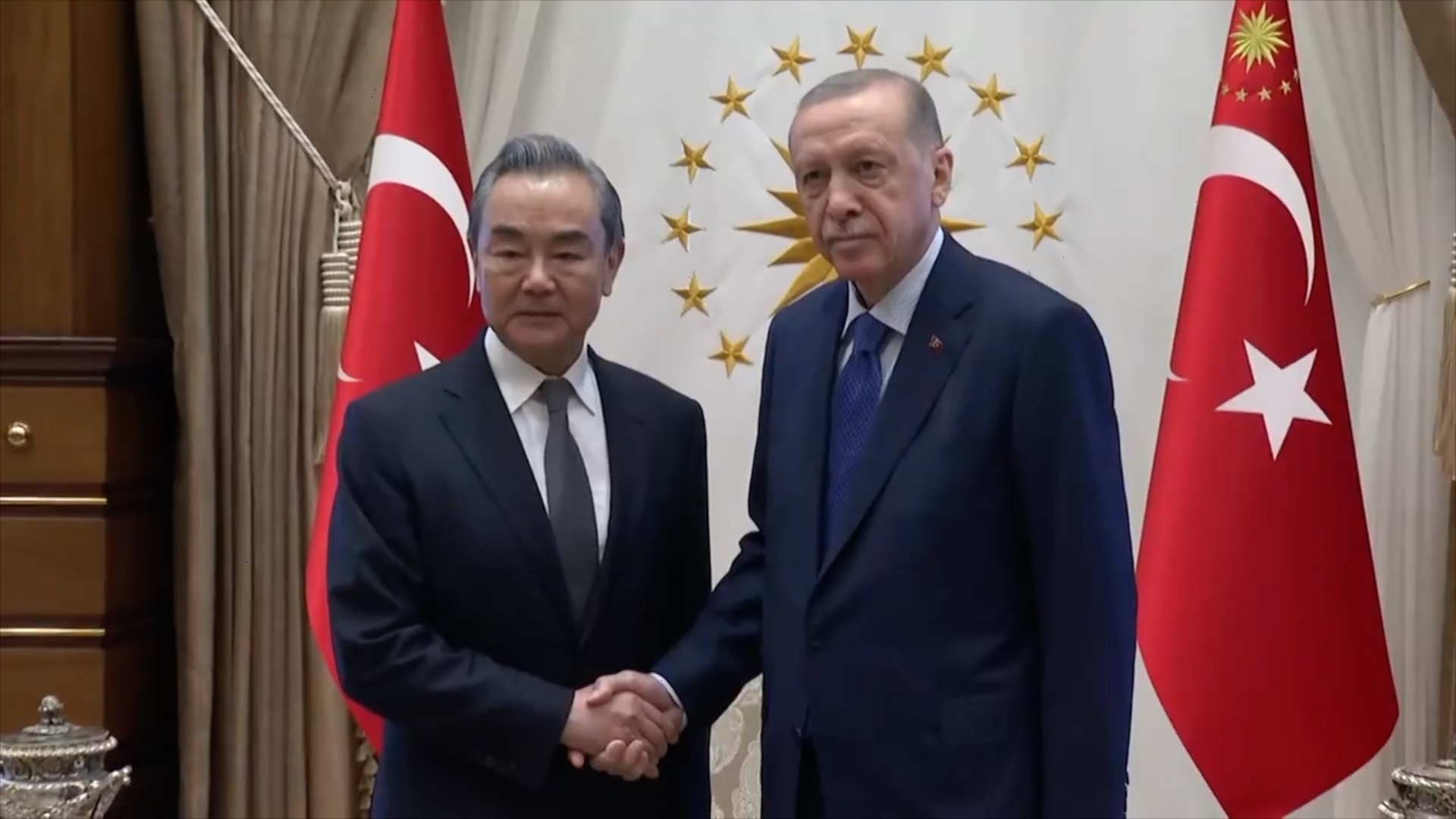 Turkish President Recep Tayyip Erdogan met with senior Chinese diplomat Wang Yi in Ankara on Wednesday and discussed enhancing bilateral cooperation in various fields. Erdogan emphasized Türkiye's adherence to the one-China principle and said his country does not see China's development as a threat. For his part, Wang conveyed the Chinese president's greetings to Erdogan. He told the Turkish president that China congratulates him on his re-election and supports Türkiye in upholding independence and pursuing a development path suited to its national conditions.