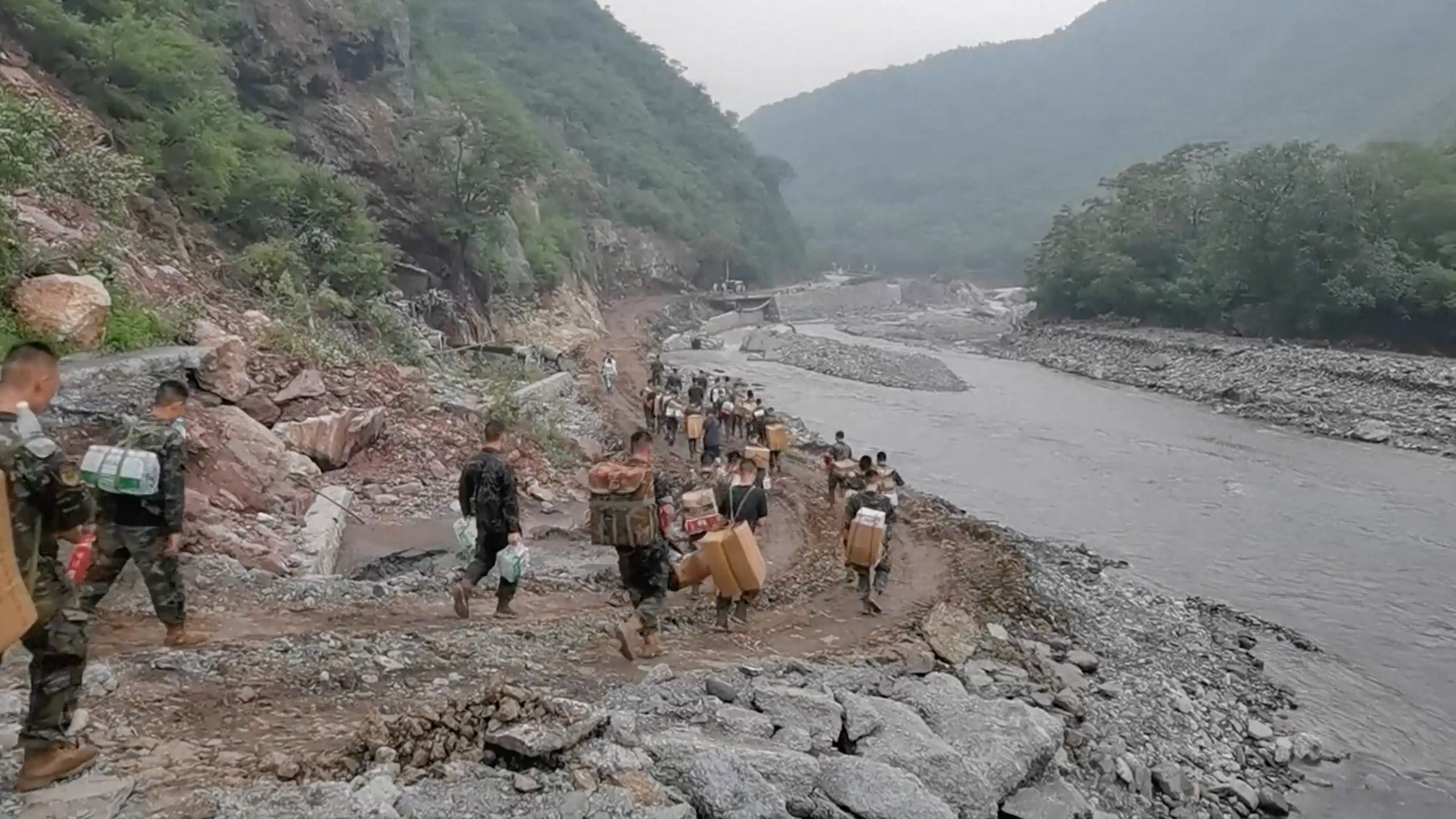 Soldiers of the Chinese People's Armed Police Force walked 6 kilometers to deliver urgent supplies to residents in Beijing's flood-hit Mentougou District on August 3. In the district's Wangping Town, some roads were cut off by floods or blocked by sludge and debris. Soldiers had to walk through those damaged roads in order to send necessities to over 2,600 residents who were evacuated to a local elementary school in Datai Subdistrict. At around 3:00 p.m., 176 soldiers headed to the elementary school, each carrying over 25 kilograms of supplies such as food, clothes and medicine.