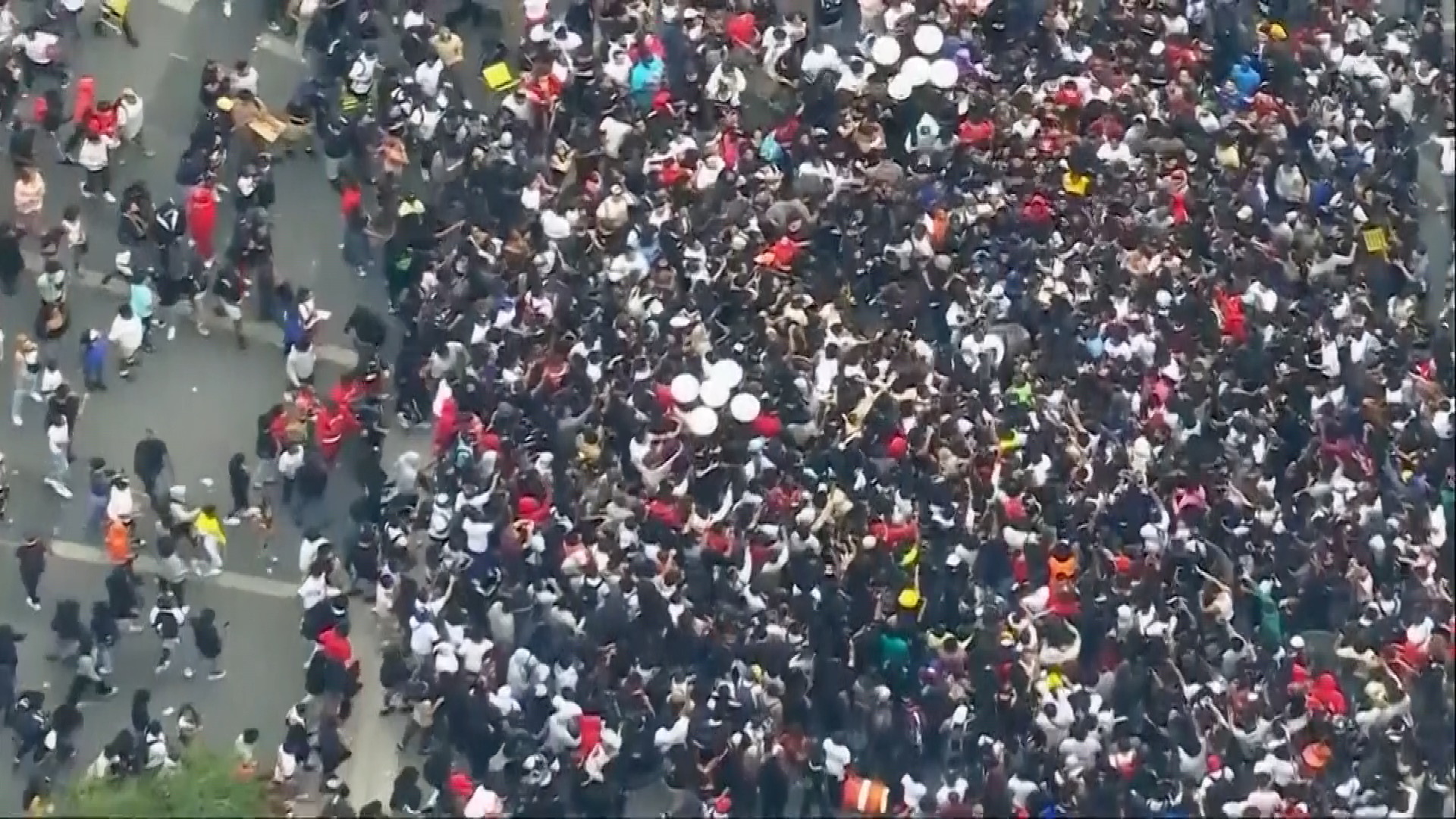 Aerial TV news footage showed a surging, tightly packed crowd running through the streets, scaling structures in the park and snarling traffic. Shouting teenagers swung objects at car windows, threw paint cans and set off fire extinguishers.
