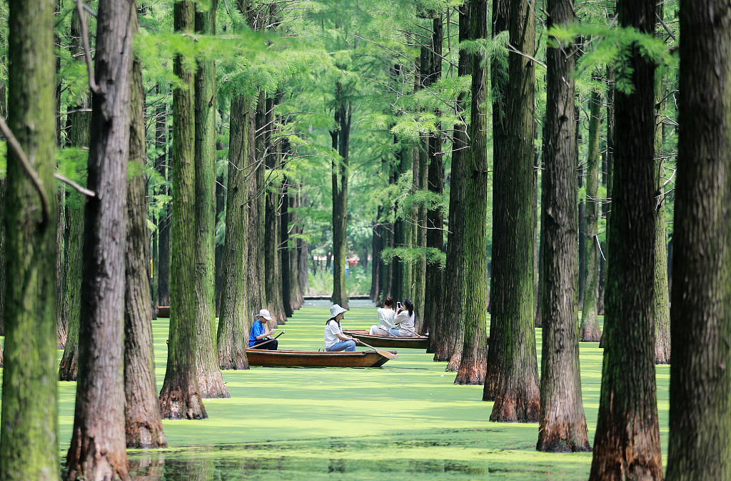 A photo shows tourists paddling between trees in the Luyanghu Wetland Park on July 21, 2023 in Yangzhou, Jiangsu. /CFP