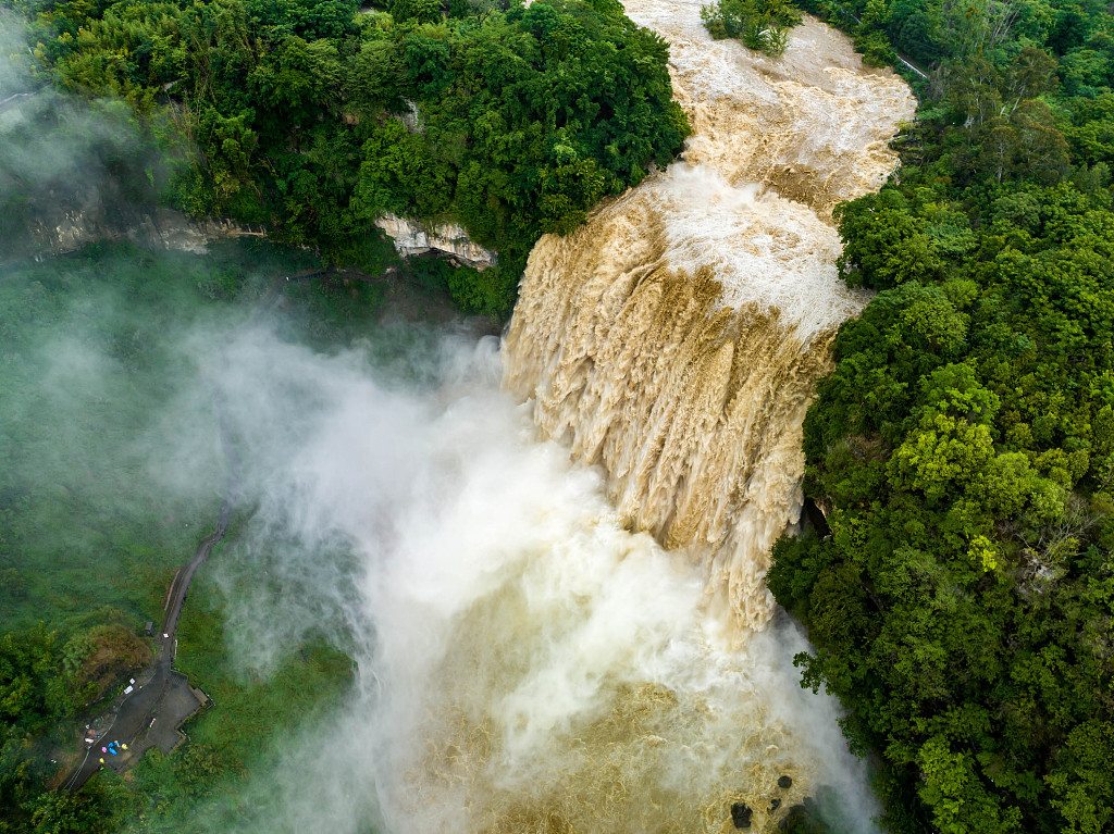 A photo shows a heavy flow of water at the Huangguoshu Waterfall on July 4, 2023 in Anshun, Guizhou. /CFP