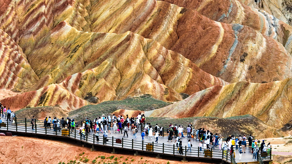 Tourists marvel at the colorful Danxia landforms on July 19, 2023 in Zhangye, Gansu. /CFP