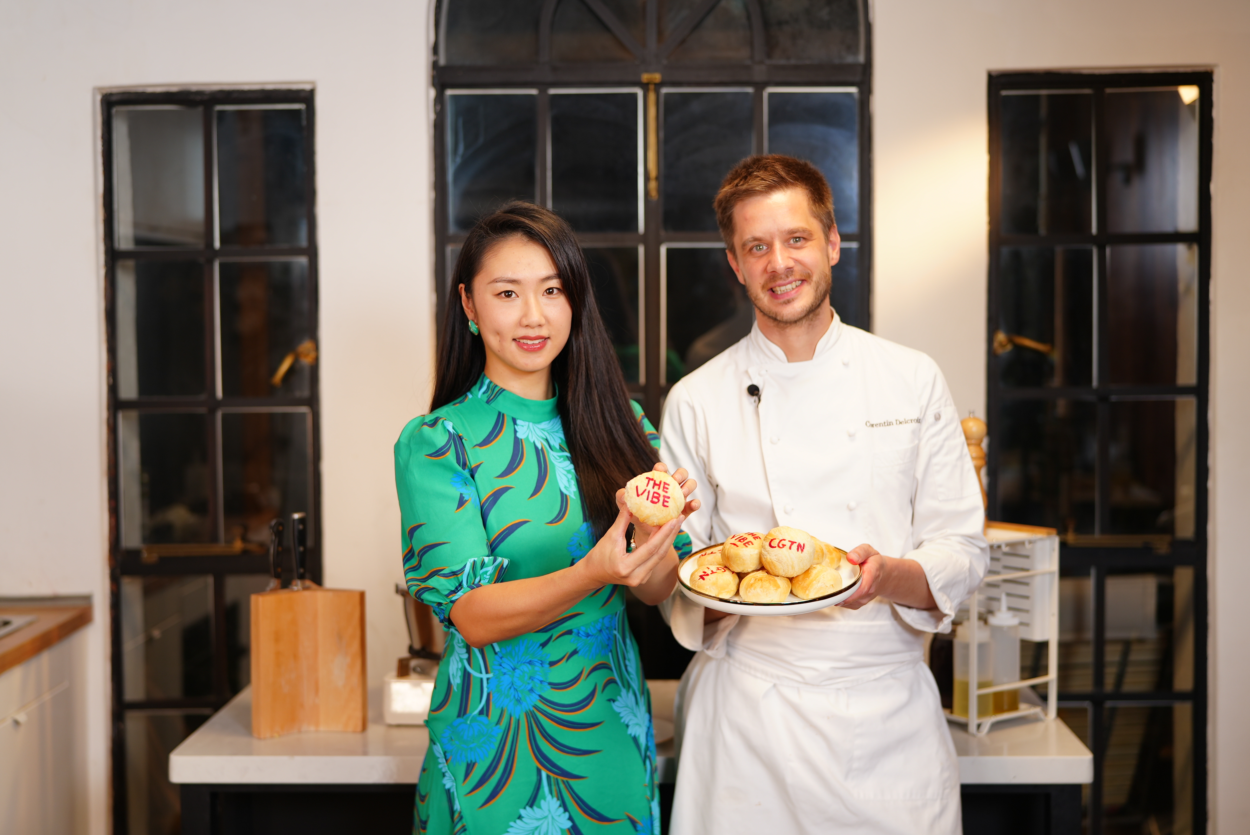 Reporter Lyne Lin and French Chef Corentin Delcroix show some fresh cooked mooncakes printed with logos of CGTN and The Vibe. /CGTN