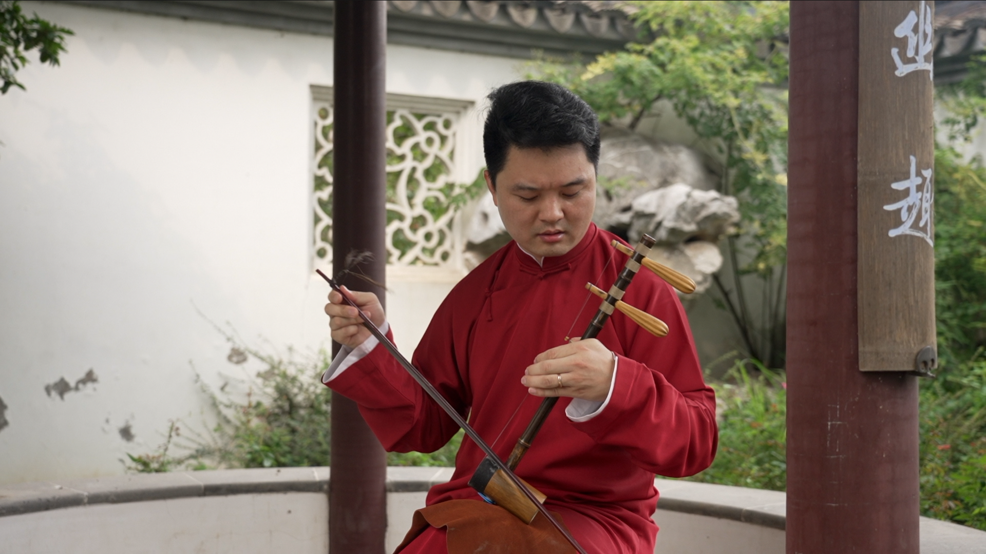 Peking Opera enthusiast Ma Yuedong plays the jinghu. /CGTN
