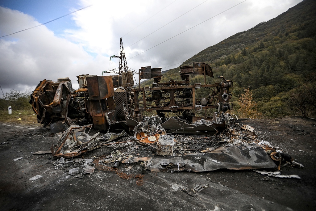 A burned Armenian truck is seen on the road, near Khankendi in Nagorno-Karabakh region, October 3, 2023. /CFP