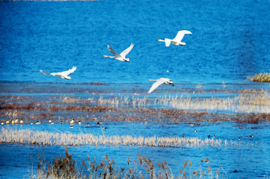 More than 60 swans have arrived at the Huairou Reservoir on the outskirts of Beijing to spend the winter there. The fish in the reservoir, as well as the shallows and the reeds there, provide an ideal environment for the migratory birds to inhabit during winter.