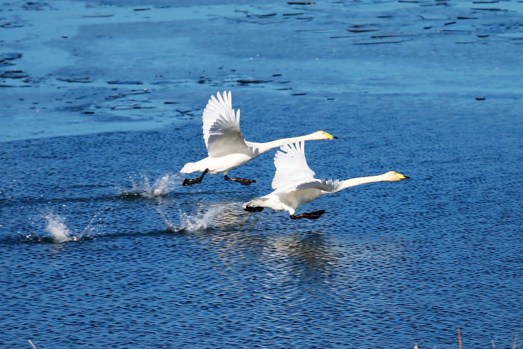 Swans take off from the Huairou Reservoir on the outskirts of Beijing on December 1, 2023. /CFP