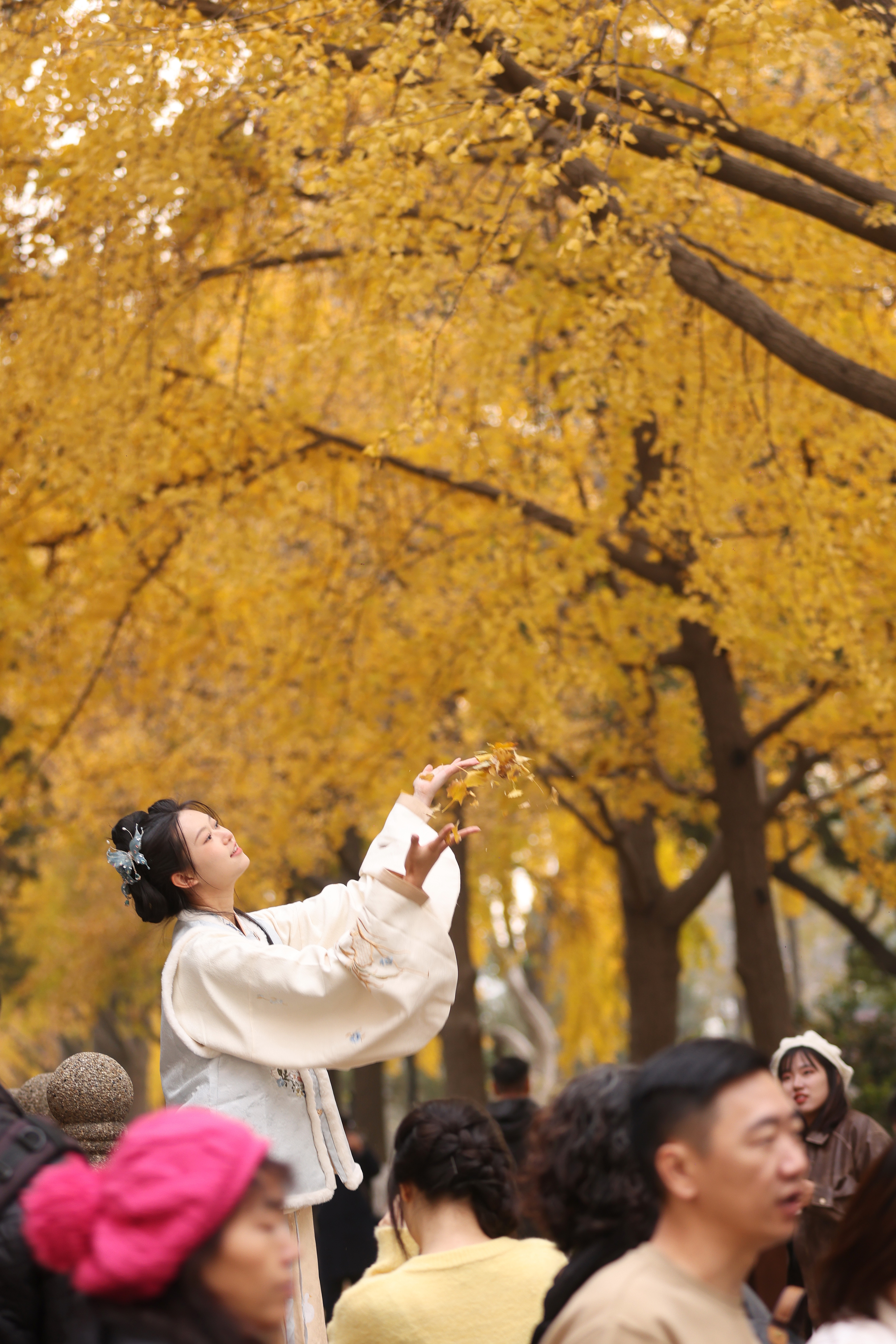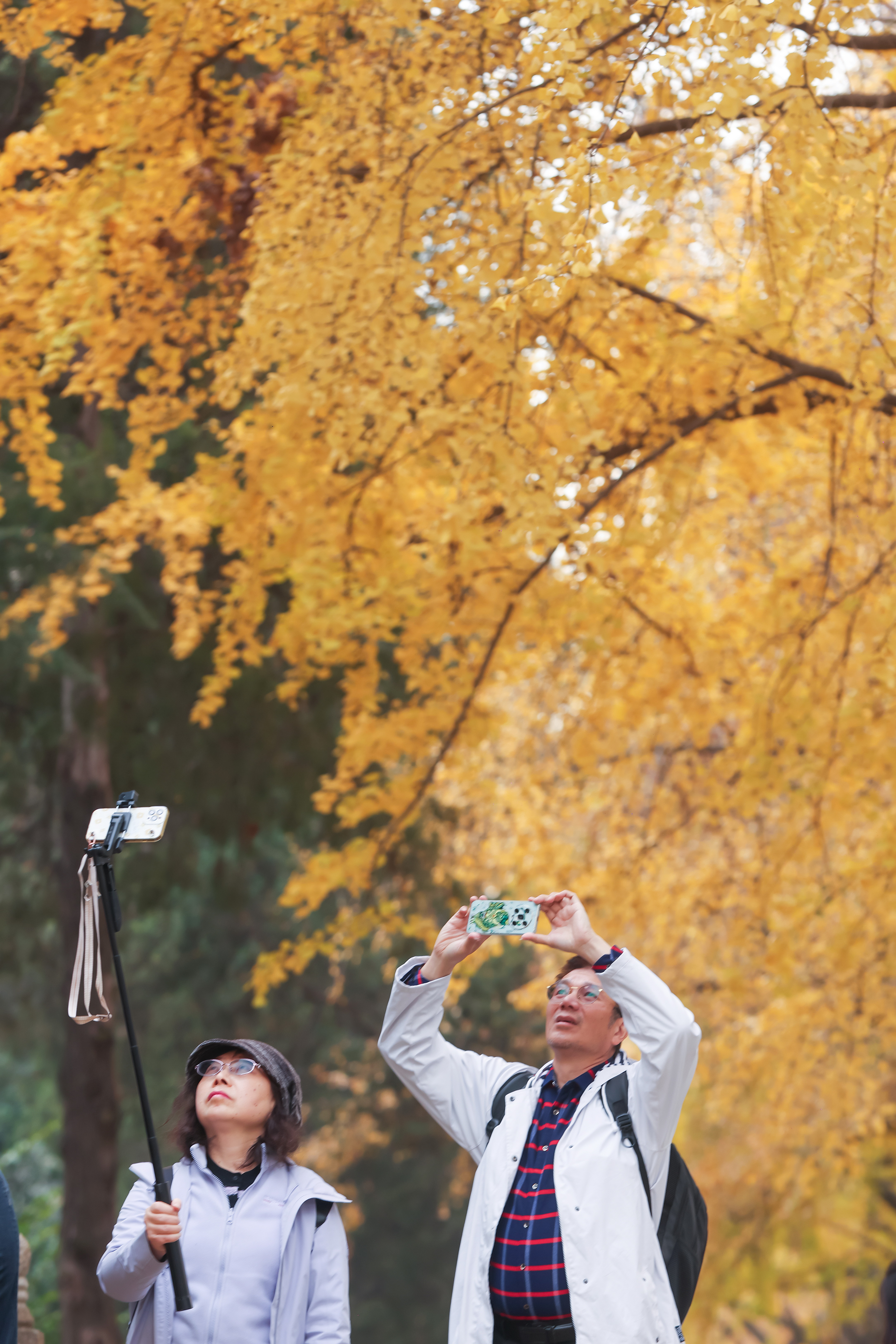 Visitors take photos of the golden ginkgo leaves at Xuanwu Lake Park in Nanjing City, Jiangsu Province, December 4, 2023. /IC