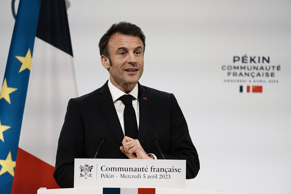 French President Emmanuel Macron gives a speech as he meets the French community in Beijing, China, April 5, 2023. /CFP