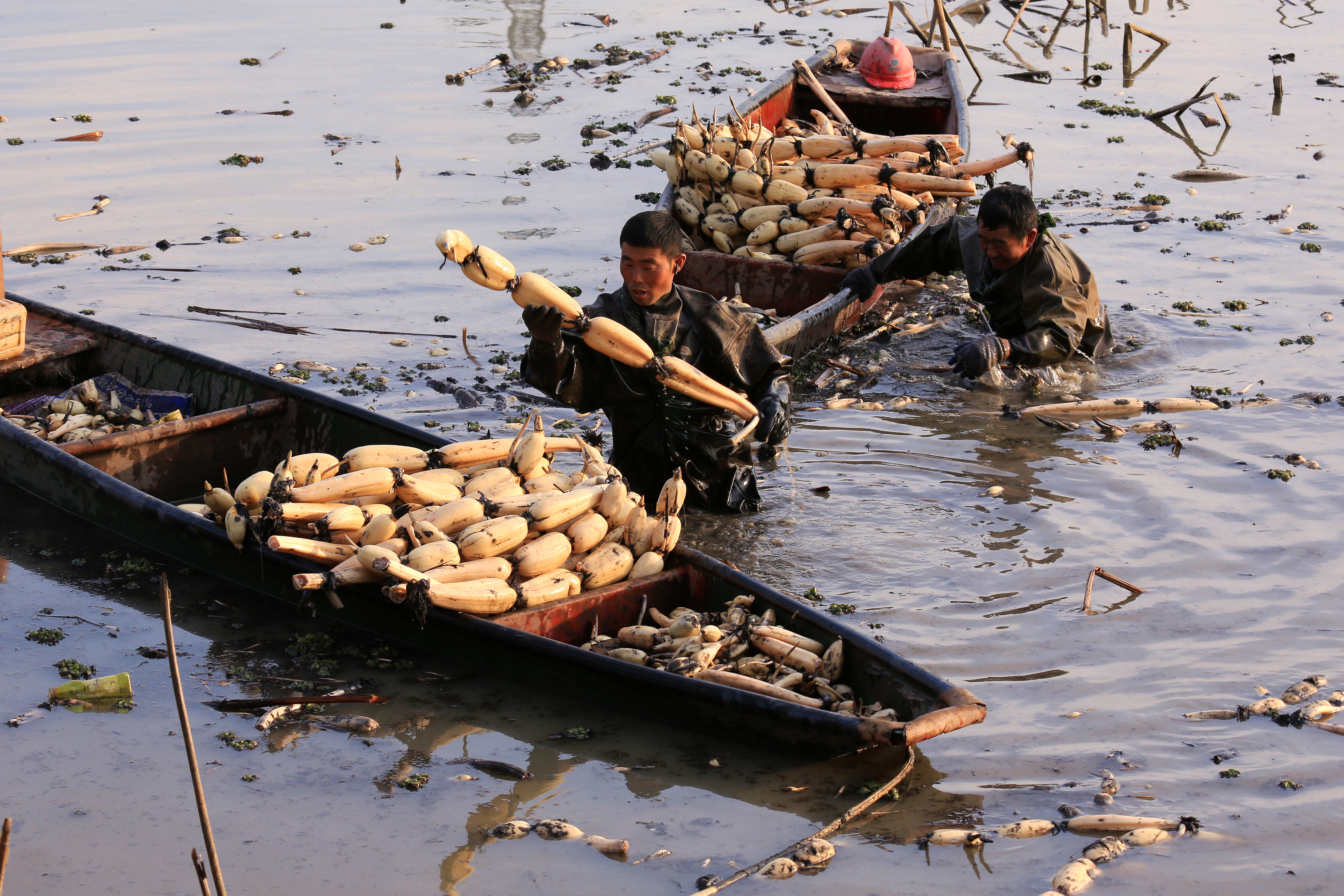 Farmers harvest lotus roots in Jinhua, Zhejiang Province on December 3, 2023. /IC