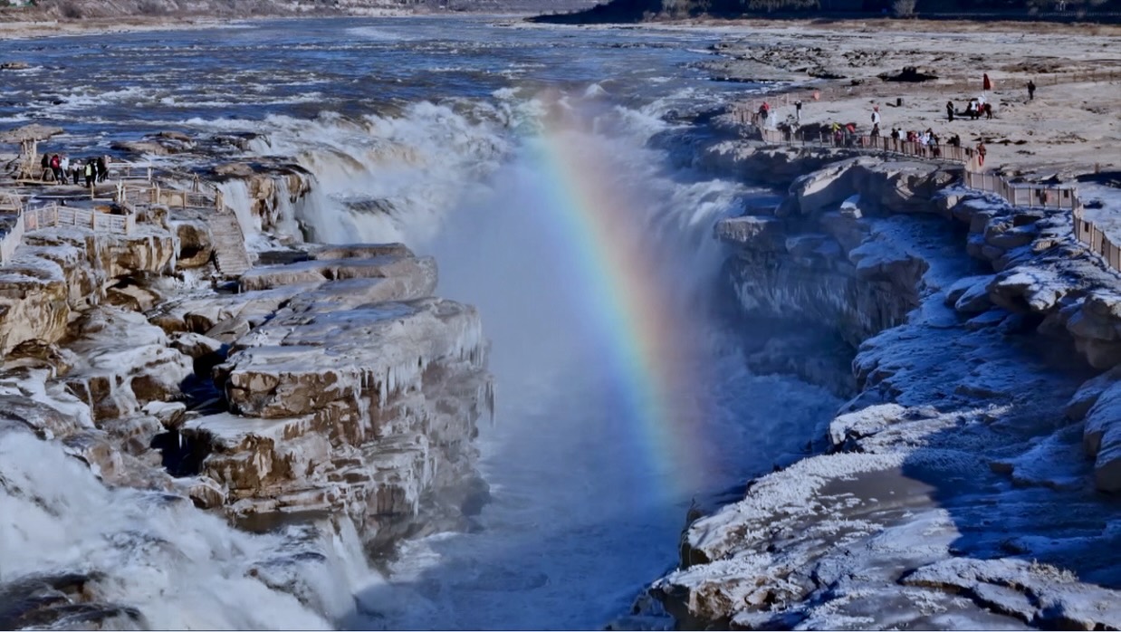 Hukou Waterfall has turned to ice amid a drop in temperatures in Jixian County, north China's Shanxi Province. The Yellow River pouring over the cliff and the small frozen waterfalls on both sides unite to create a spectacular scene that wows visitors. More parts of the Hukou Waterfall are expected to freeze in the coming days, allowing more tourists to appreciate the beauty and charm of winter. Hukou Waterfall is on the Yellow River, on the border area between north China's Shanxi and northwest China's Shaanxi provinces.