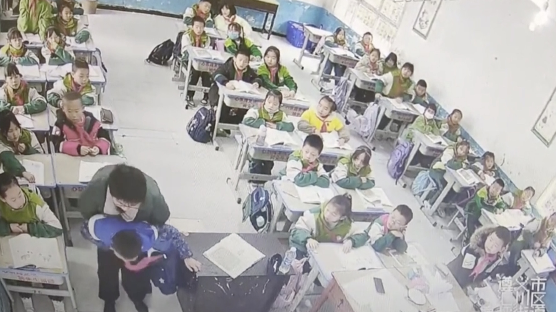 This dramatic video shows the moment a brave teacher saved a young schoolboy when he was choking on a pen cap in the middle of class at the Paijun Primary School in southwest China's Zunyi city. The boy was reportedly solving a math problem at his desk when he inadvertently swallowed a pen cap. The female teacher, identified as Liu Xianghong, rushed to the student's seat and sprang into action, performing the Heimlich maneuver until he spat out the cap.