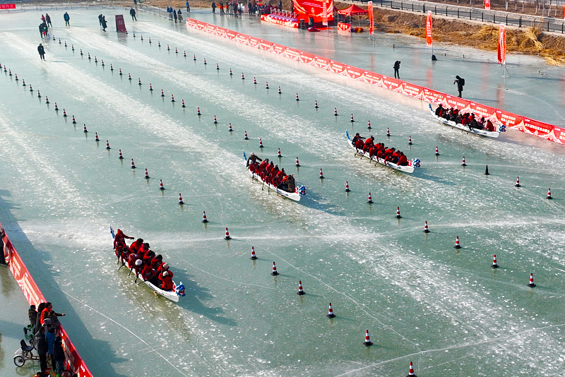 Teams compete at an ice dragon boat race in Yinchuan City, Ningxia Hui Autonomous Region, January 13, 2024. /CFP