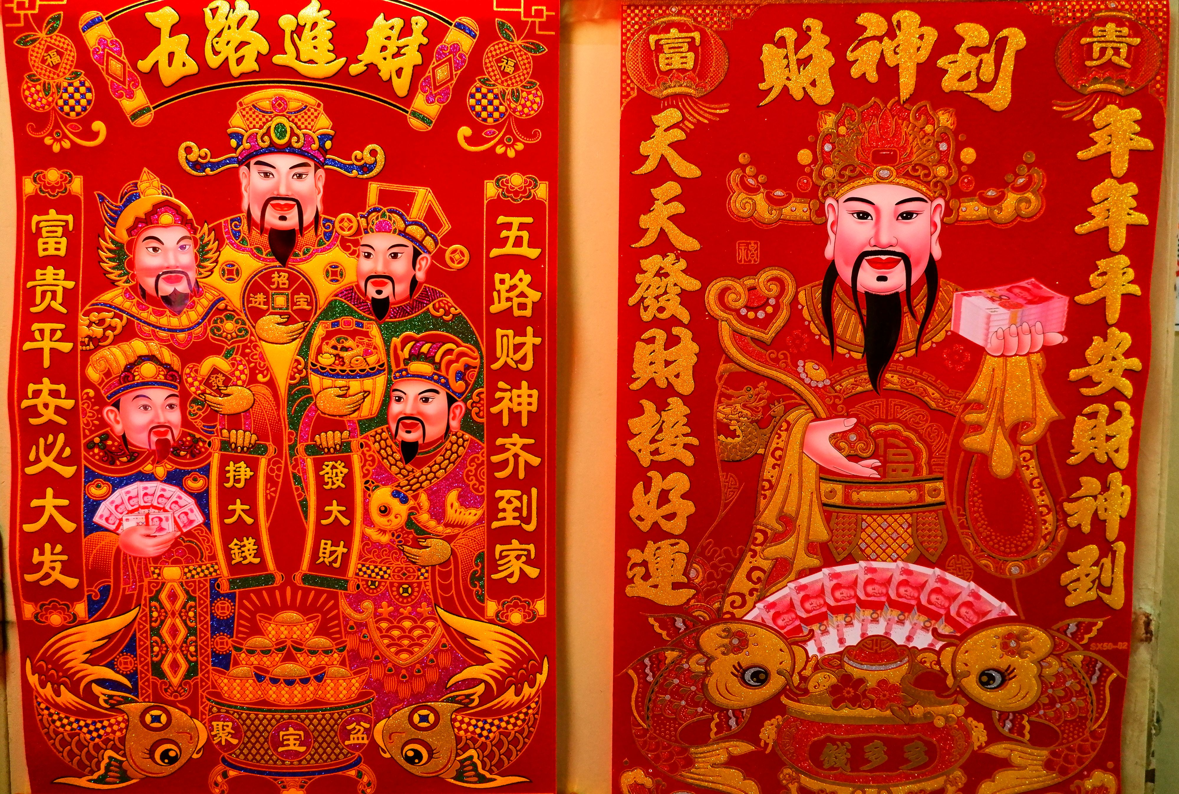 Festive pictures of the God of Wealth, or "Caishen" in Chinese, a god that brings fortune to people in Chinese folklore, are seen at Xinji Market in Harbin, northeast China's Heilongjiang Province on January 18, 2024. /IC