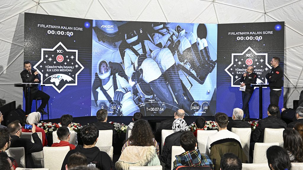 People follow on the giant screens during the blast off for the International Space Station with the Axiom Mission 3 crew, Ankara, Türkiye, January 18, 2024. /CFP
