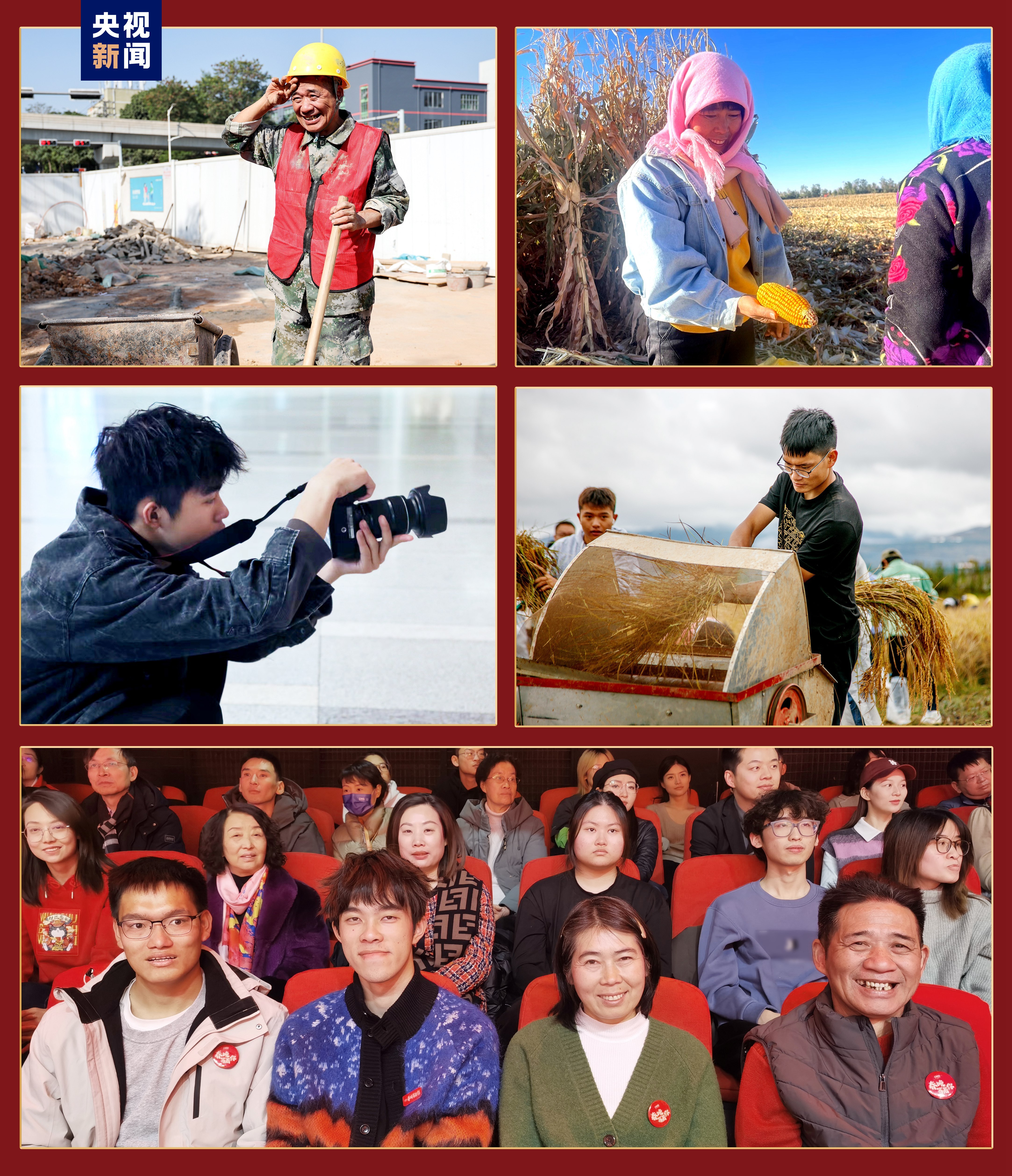 (Bottom photo from left to right) University student Ding Xigong, photographer Shi Jiadong, farmer Pei Aimin and migrant worker Yi Qunlin attend the second rehearsal of the Spring Festival Gala in Beijing on January 21, 2024. /CMG