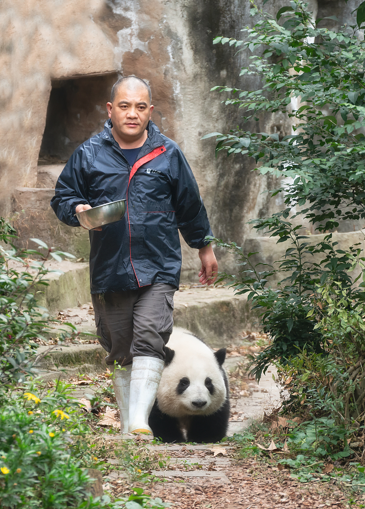 Panda keeper Tan Jintao and giant panda Hua Hua are seen at the Chengdu Research Base of Giant Panda Breeding in Chengdu, Sichuan Province on January 19, 2024. /CFP