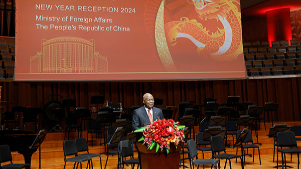 Martin Mpana, dean of the foreign diplomatic corps in China and Cameroon's ambassador to China, speaks at the Chinese Foreign Ministry's 2024 New Year reception at the National Center for the Performing Arts in Beijing, January 31, 2024. /Chinese Foreign Ministry