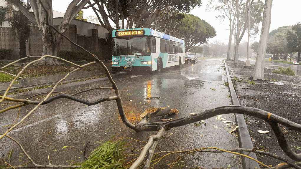 Vehicles pass downed branches during a rainstorm in Goleta city in southern Santa Barbara County, California, February 4, 2024. /CFP