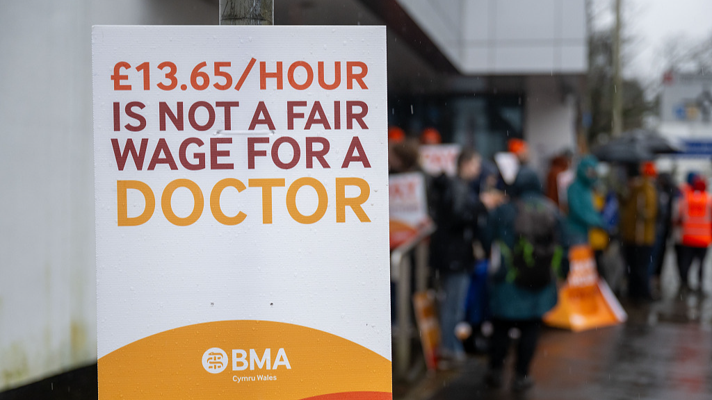 Doctors and supporters gather at the University Hospital of Wales at the beginning of a 72-hour strike in Cardiff, United Kingdom, February 21, 2024. /CFP