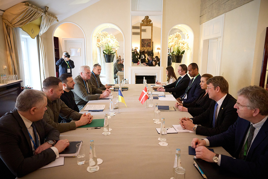 Ukrainian President Volodymyr Zelenskyy (3rd L) holds a meeting with Danish Prime Minister Mette Frederiksen (3rd R) in Munich, Germany, February 17, 2024. /CFP