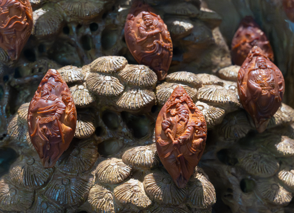 Known as "hediao" in Chinese, kernel carving is a traditional form of micro-sculpture, most commonly crafted from the kernels of olives, peaches, apricots, and walnuts. Within these hard, tiny, rugged pits, under the skilled touch of experienced artisans, vibrant images of Buddha, animals, plants, and boats emerge, seemingly by magic, all within this tightly confined space. Recognized for its intricacy and elegance, the craft that reveals the boundlessness of the universe and the rich tapestry of life on such a minuscule canvas is celebrated as a marvel of sculpture. The town of Guangfu in Suzhou, east China's Jiangsu Province is renowned for its olive-kernel carving, earning it the distinction of being listed as a national intangible cultural heritage in 2008.