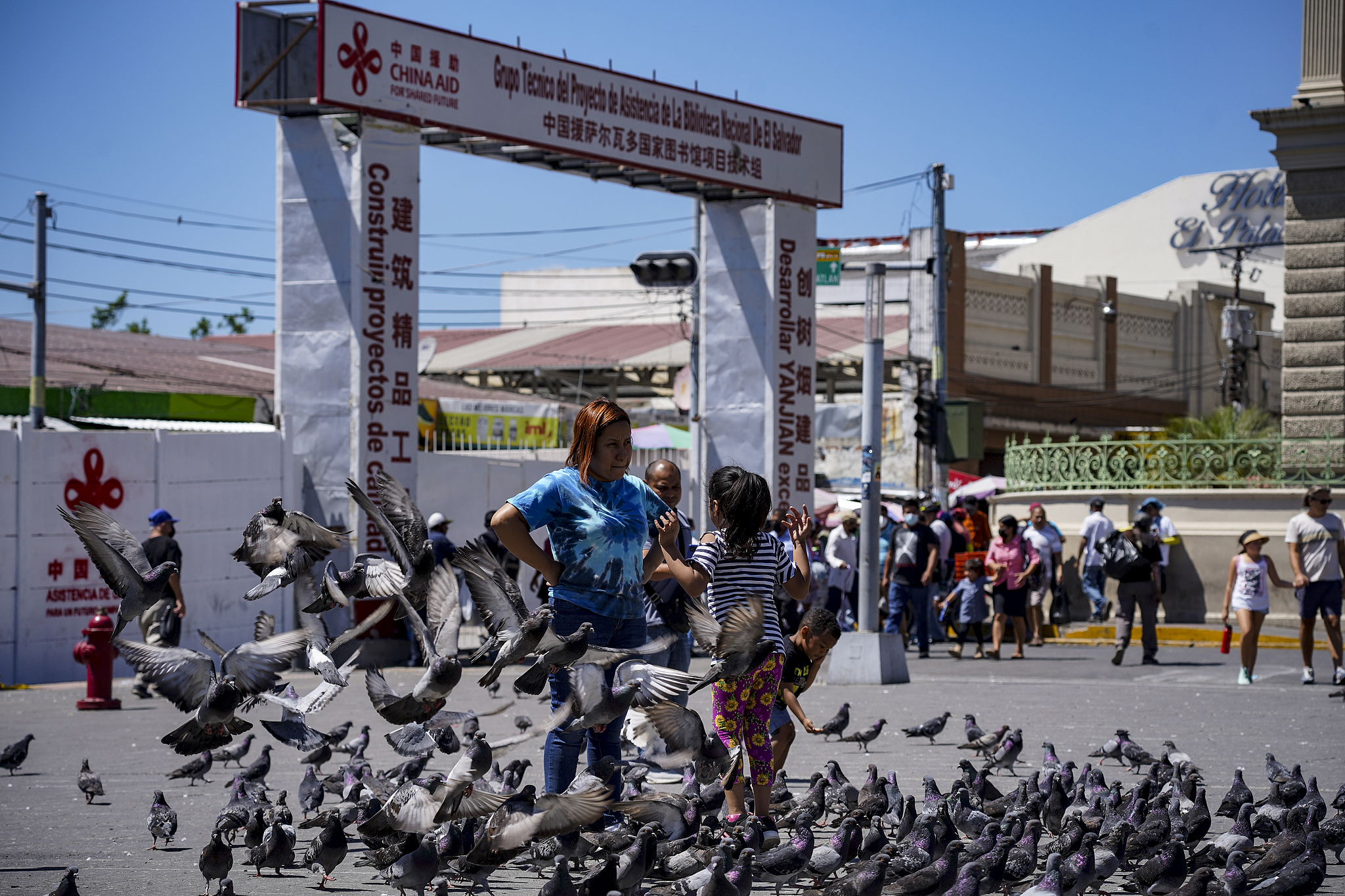 A woman and her daughter feed pigeons next to a construction site of the new Salvadoran National Library aided by China in San Salvador, El Salvador, February 21, 2022. /CFP