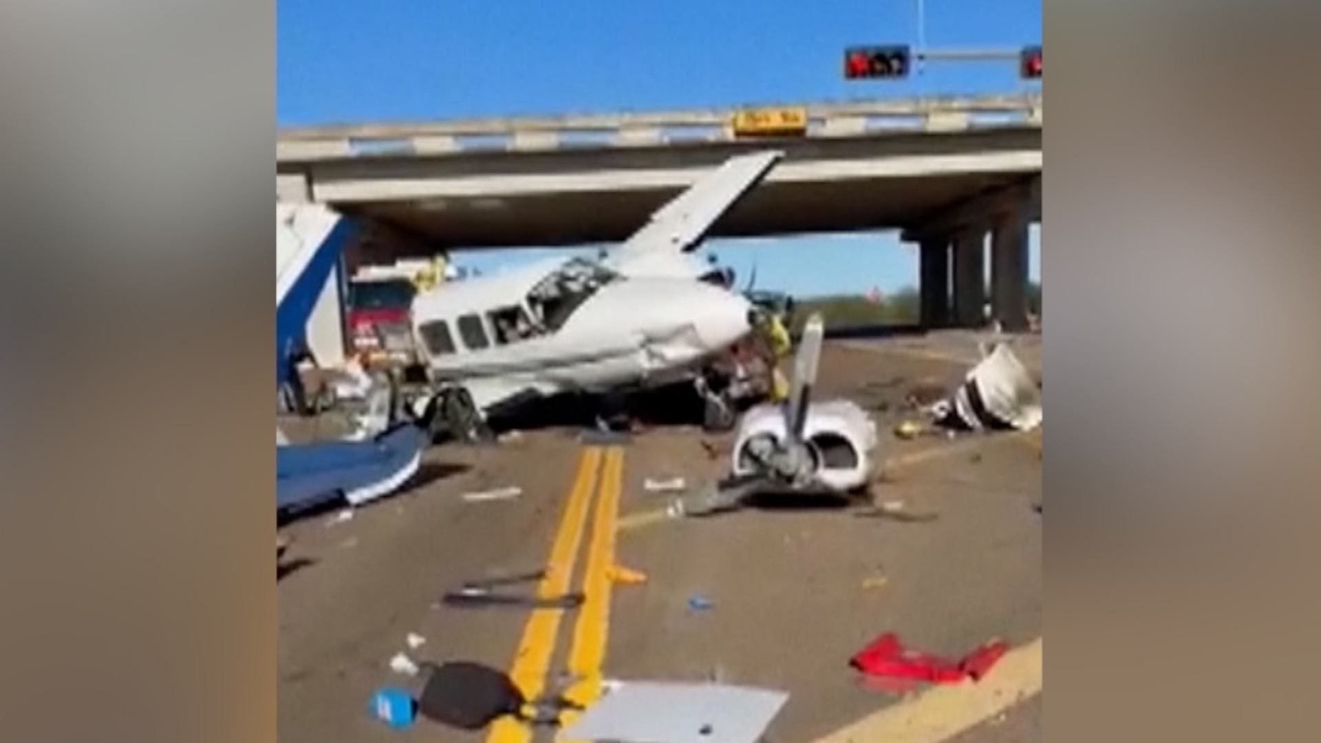 A twin-engine propeller plane crashed onto a Texas highway on December 11, splitting in two and leaving debris scattered across the roadway. The Federal Aviation Administration said the only person on board the Piper PA-31 was the pilot. Victoria police said four people were taken to hospitals and three vehicles had been damaged. The pilot's name and their condition were not immediately released. The FAA said it would investigate the crash.