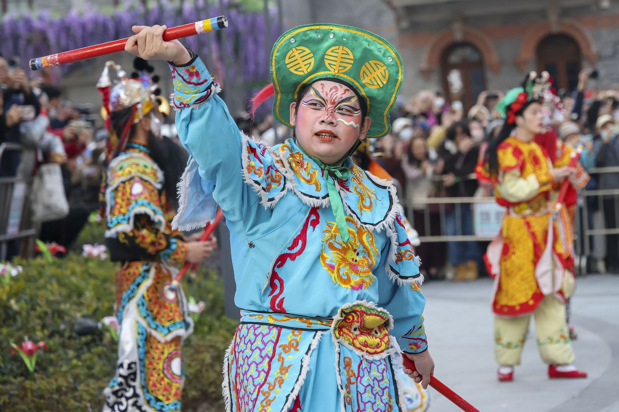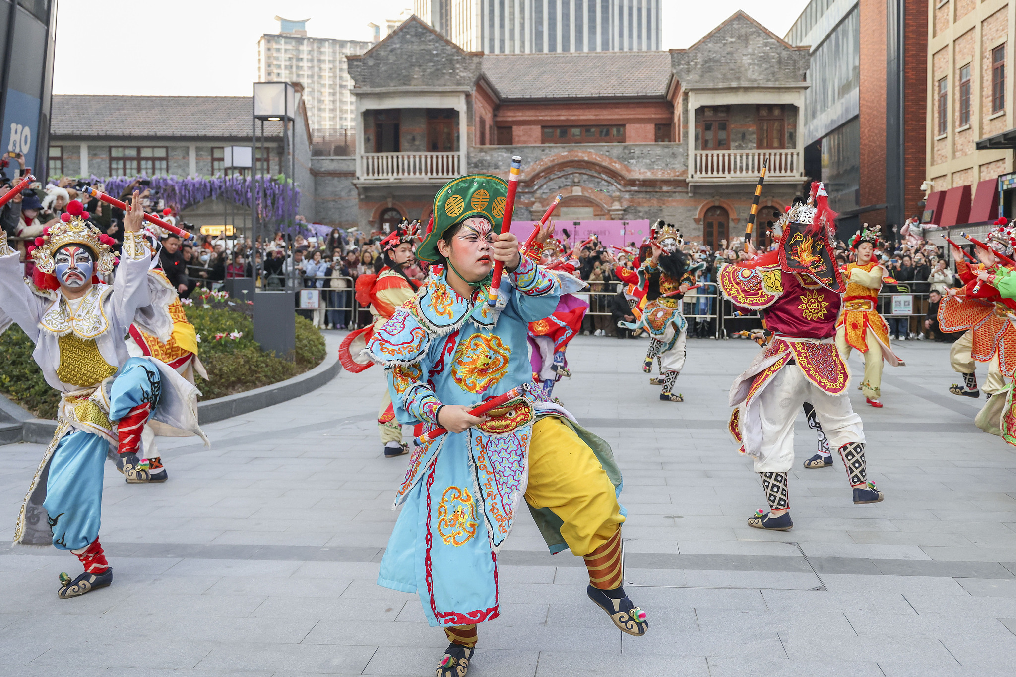 Folk artists perform Chaoshan Yingge dance at Inlet, a historic block in Shanghai, January 19, 2025. /VCG