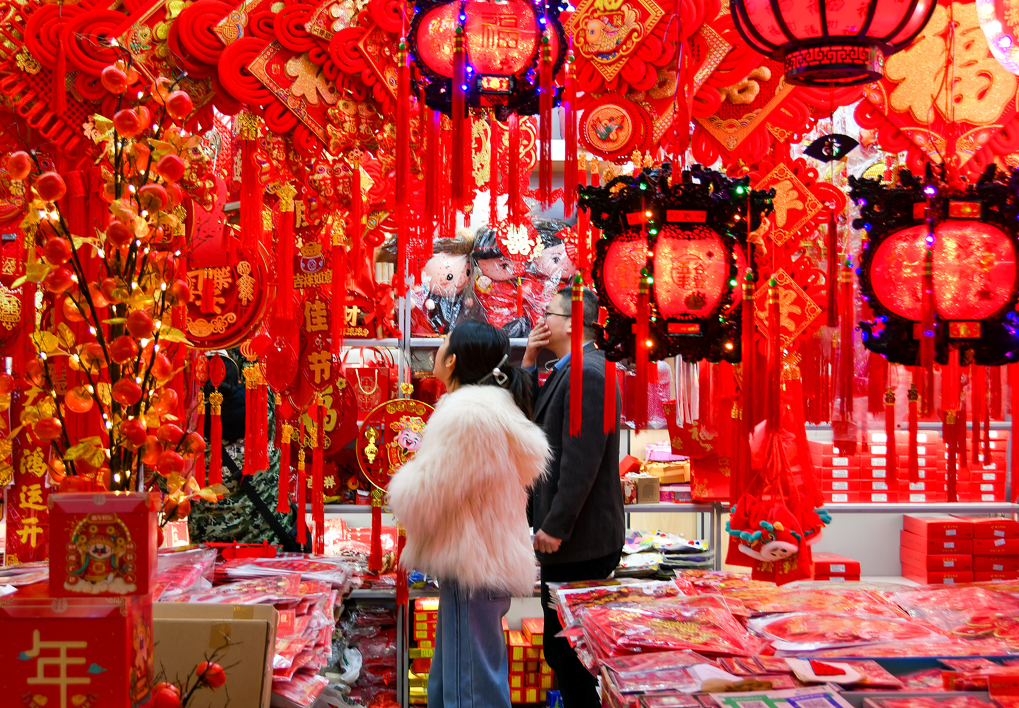 People select decorations for the Spring Festival at a market in Hengyang, Hunan Province. /VCG