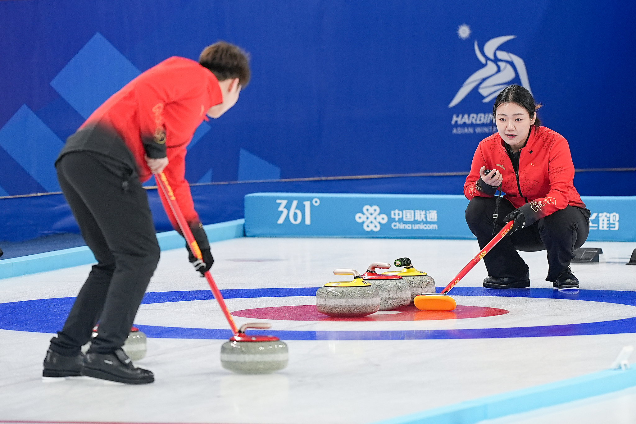 Wang Zhiyu (L) and Han Yu of China compete in the curling mixed doubles game against Marc Pfister and Kathleen Dubberstein of the Philippines at the ninth Asian Winter Games in Harbin, northeast China's Heilongjiang Province, February 5, 2025. /VCG