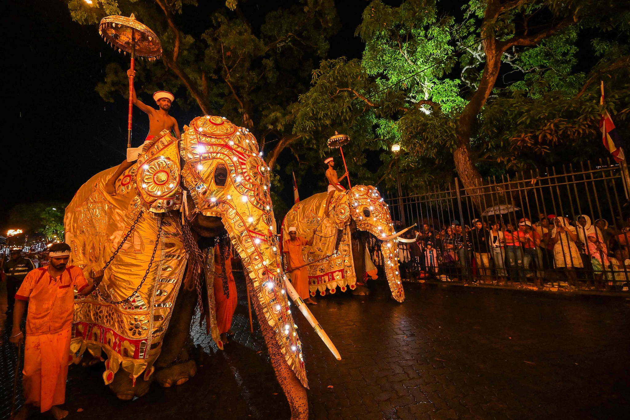 Decorated elephants walk past the historic Buddhist Temple of the Tooth during a procession celebrating the Esala Perahera festival in the ancient hill capital of Kandy, Sri Lanka, August 29, 2023. /VCG