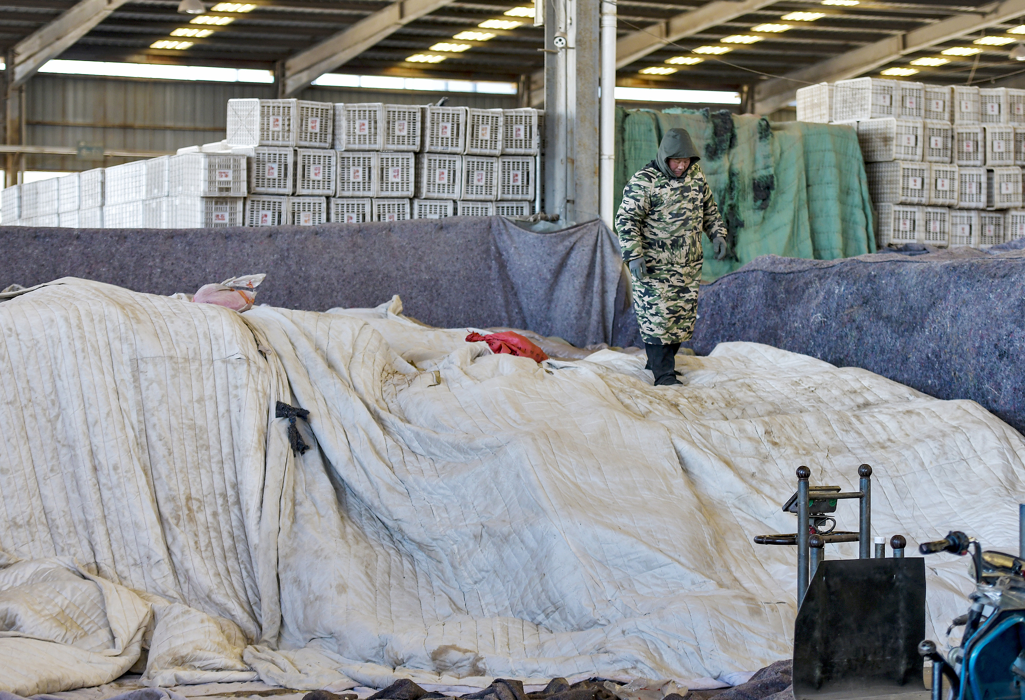Wholesalers cover vegetables with blankets to keep them warm in a vegetable market in Jinan City, Shandong Province, east China, February 7, 2025. /VCG