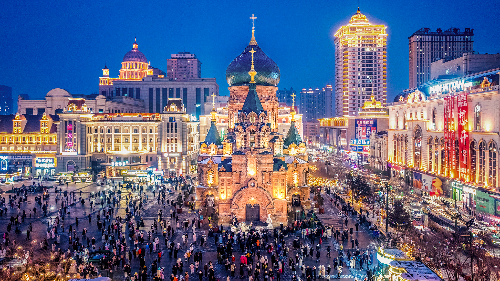 Tourists from all over the country fill up the square of St. Sophia Cathedral in Harbin on the evening of January 13, 2025./ CFP