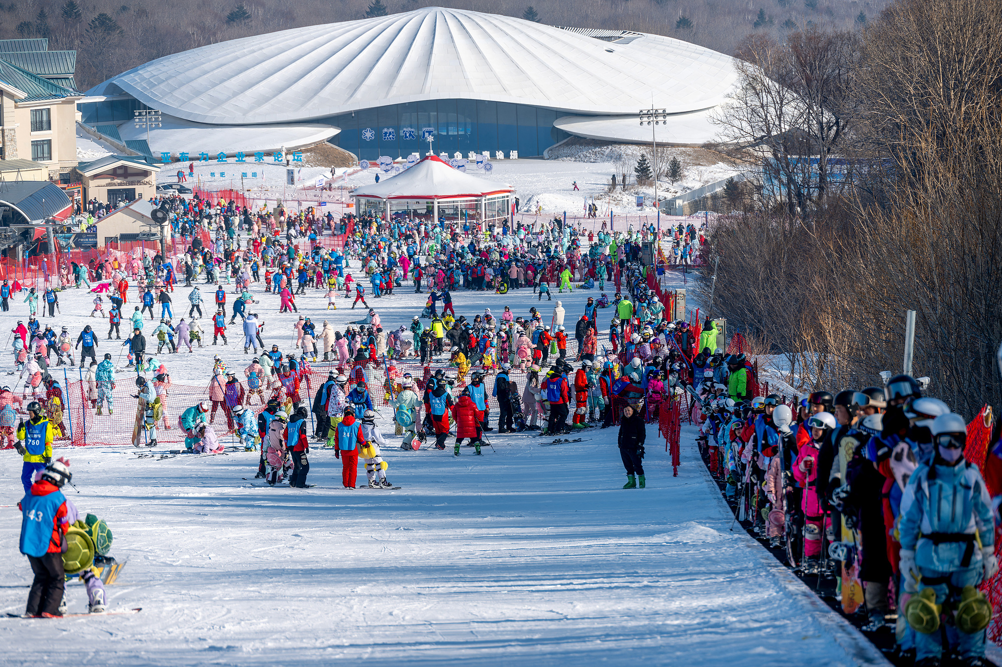 Harbin's ski resort bustles with activity, with hundreds of visitors dressed colorful ski suits enjoying themselves on the slopes on January 23, 2025./ CFP