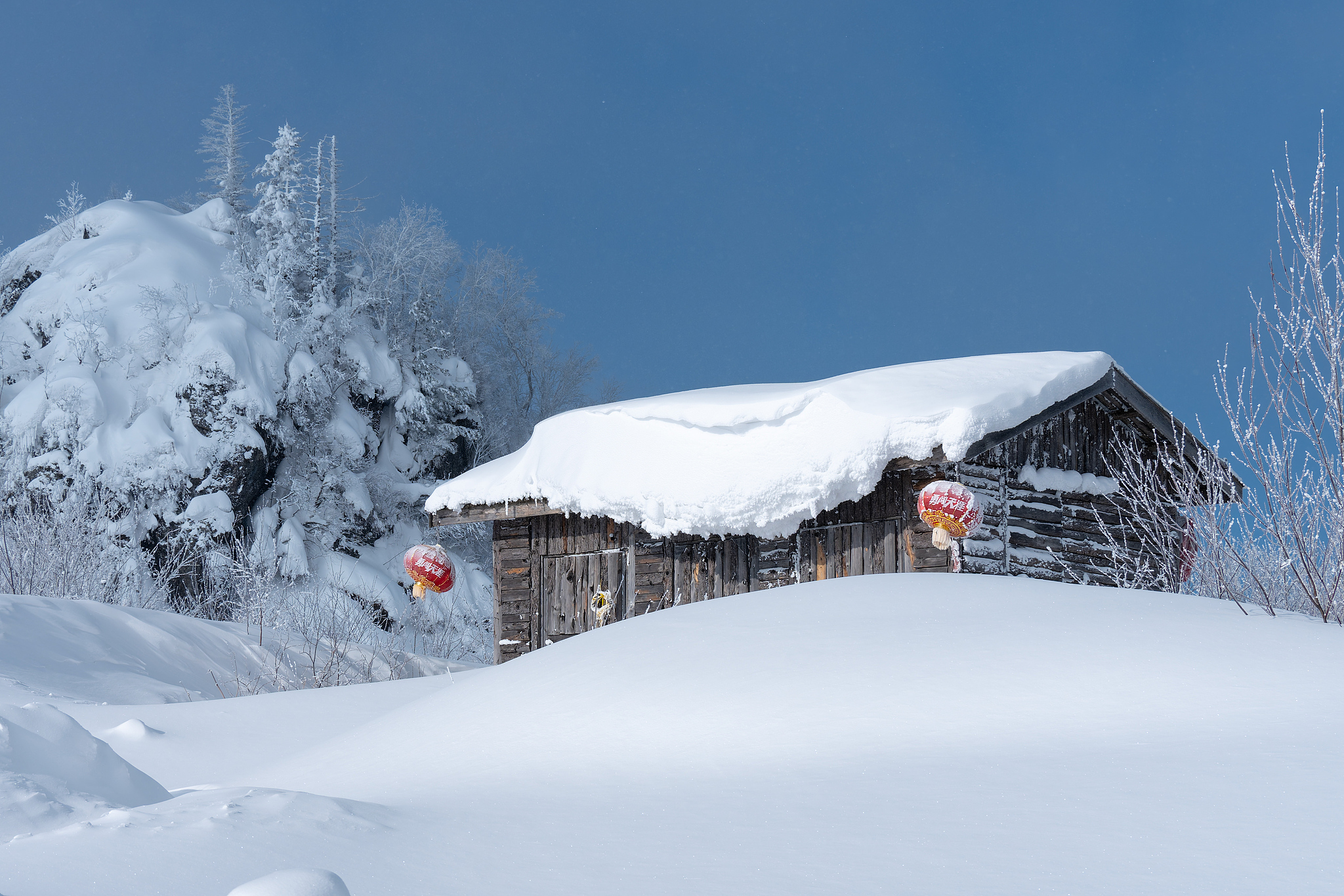 A snow-blanketed cottage is seen at Yangcao Mountain in "China Snow Town" in Mudanjiang, Heilongjiang Province on February 9, 2025. /VCG