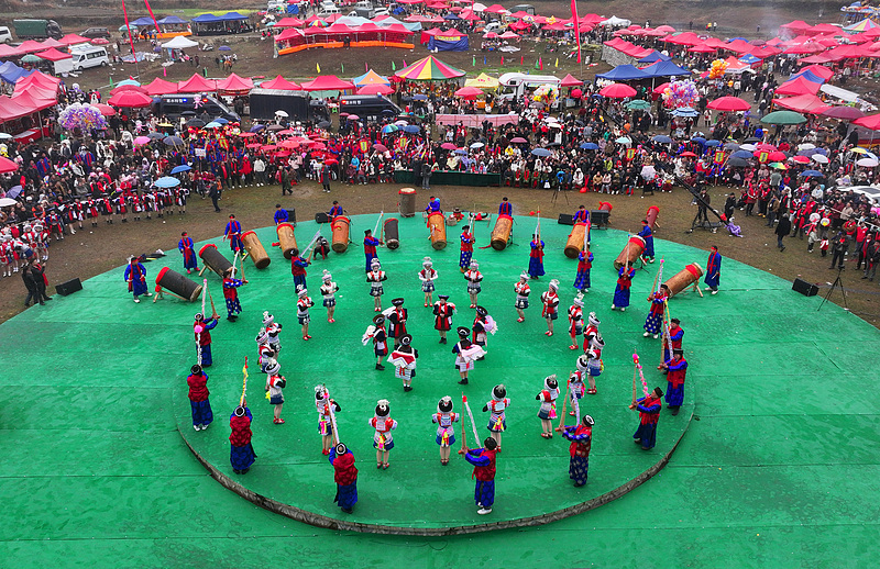 Members of the Miao ethnic group hold a grand event to celebrate this year's harvest in Huishui County, Guizhou Province, February 14, 2025. /VCG
