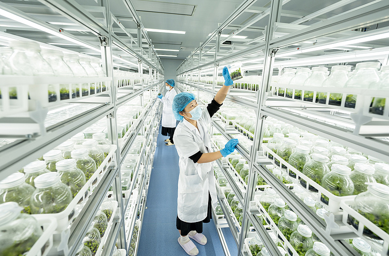 Lab workers arranging samples in a biotech company in Nantong, Jiangsu Province, China, October 31, 2024. /VCG