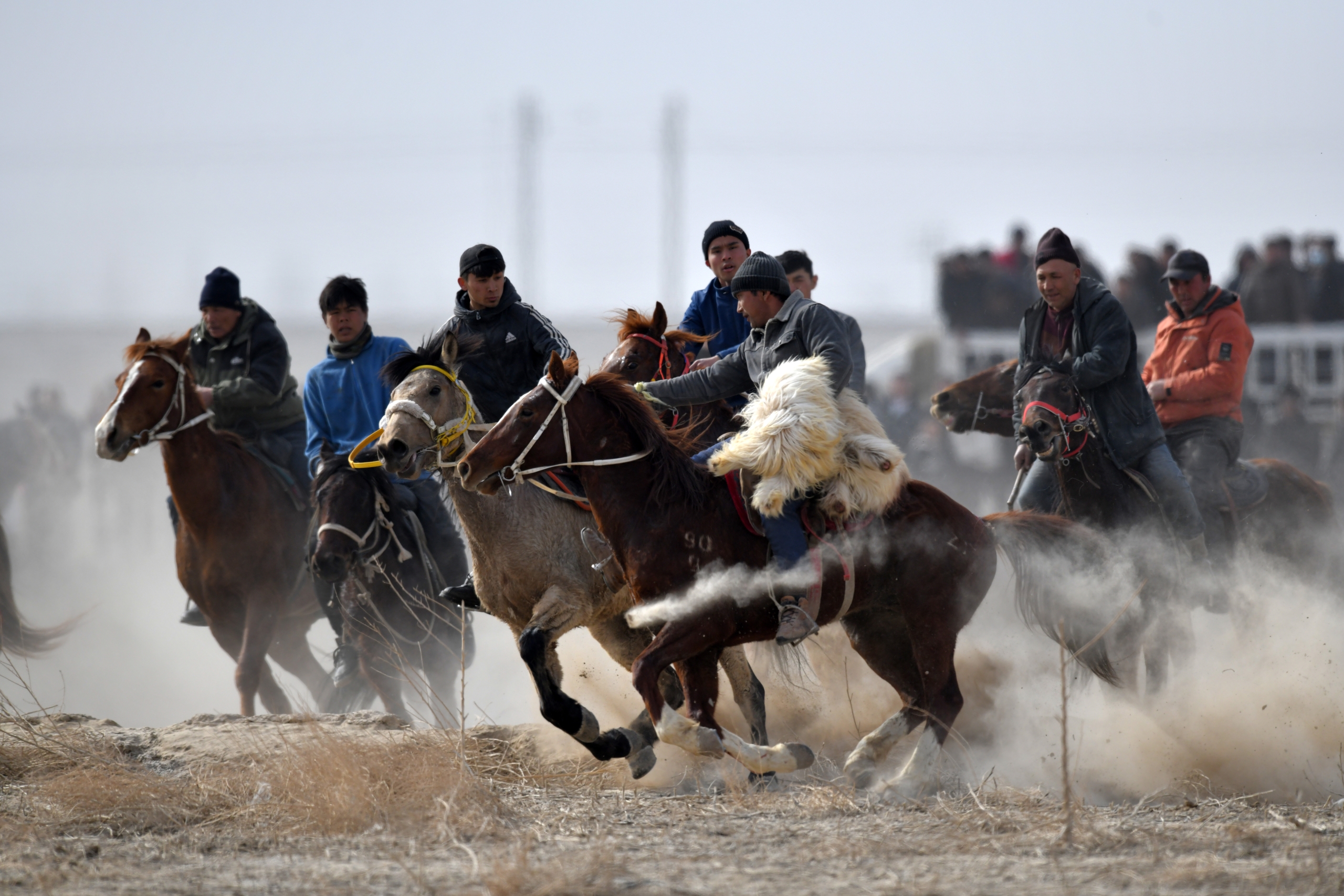 A rider is seen trying to grab the goat in the buzkashi event at the traditional sports festival for farmers and herders held in Yuli County of Xinjiang on February 16, 2025. /IC