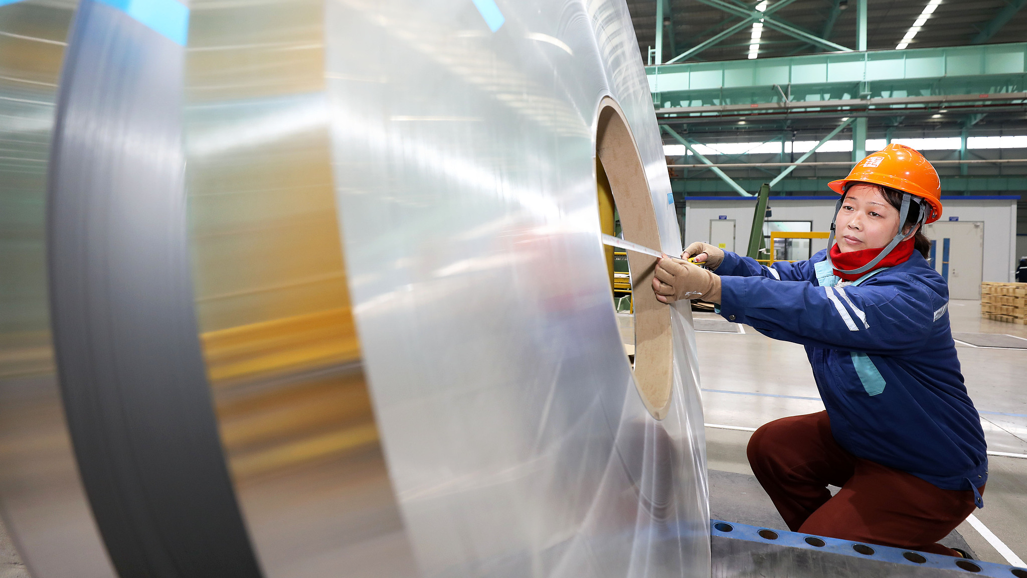 A worker checking low-carbon aluminium materials at a new energy resources company in Huaibei, Anhui Province, on February 11, 2025. /CFP