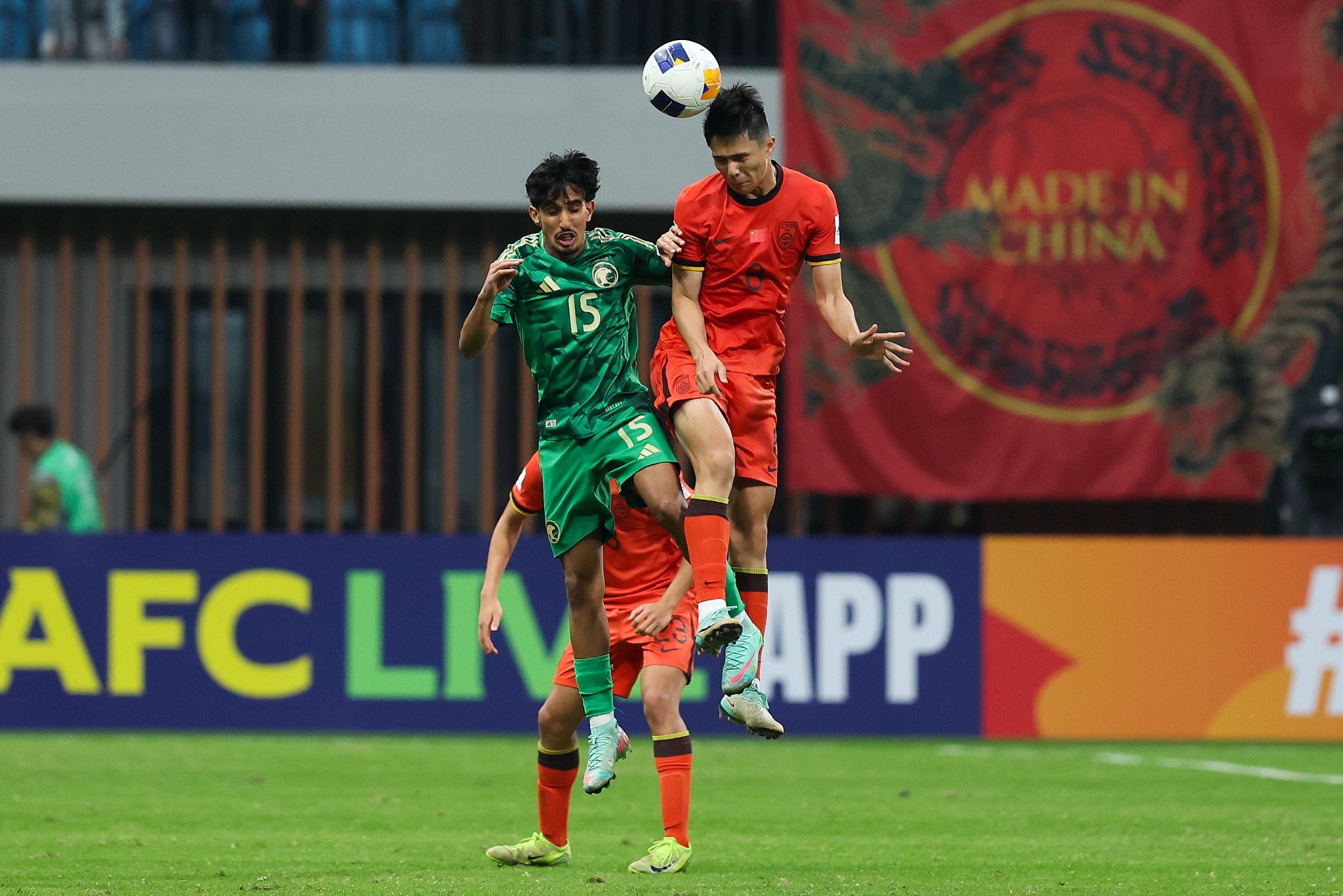 Amar Alyuhabi (#15) of Saudi Arabia competes for the ball against Chen Zeshi of China in the Asian Football Confederation (AFC) U20 Asian Cup quarterfinals in Shenzhen, south China's Guangdong Province, February 22, 2025. /VCG
