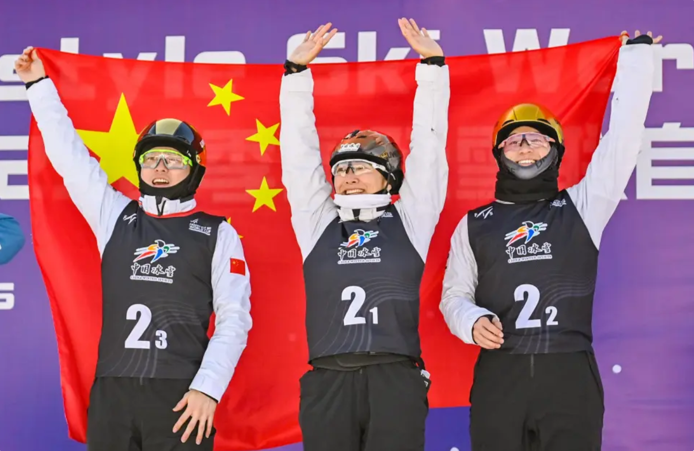 L-R: Qi Guangpu, Xu Mengtao and Li Tianma celebrate after winning the mixed team aerials title at the Federation of International Ski and Snowboard (FIS) Freestyle Skiing World Cup at Beidahu Ski Resort in Changchun, northeast China's Jilin Province, February 24, 2025. /Xinhua
