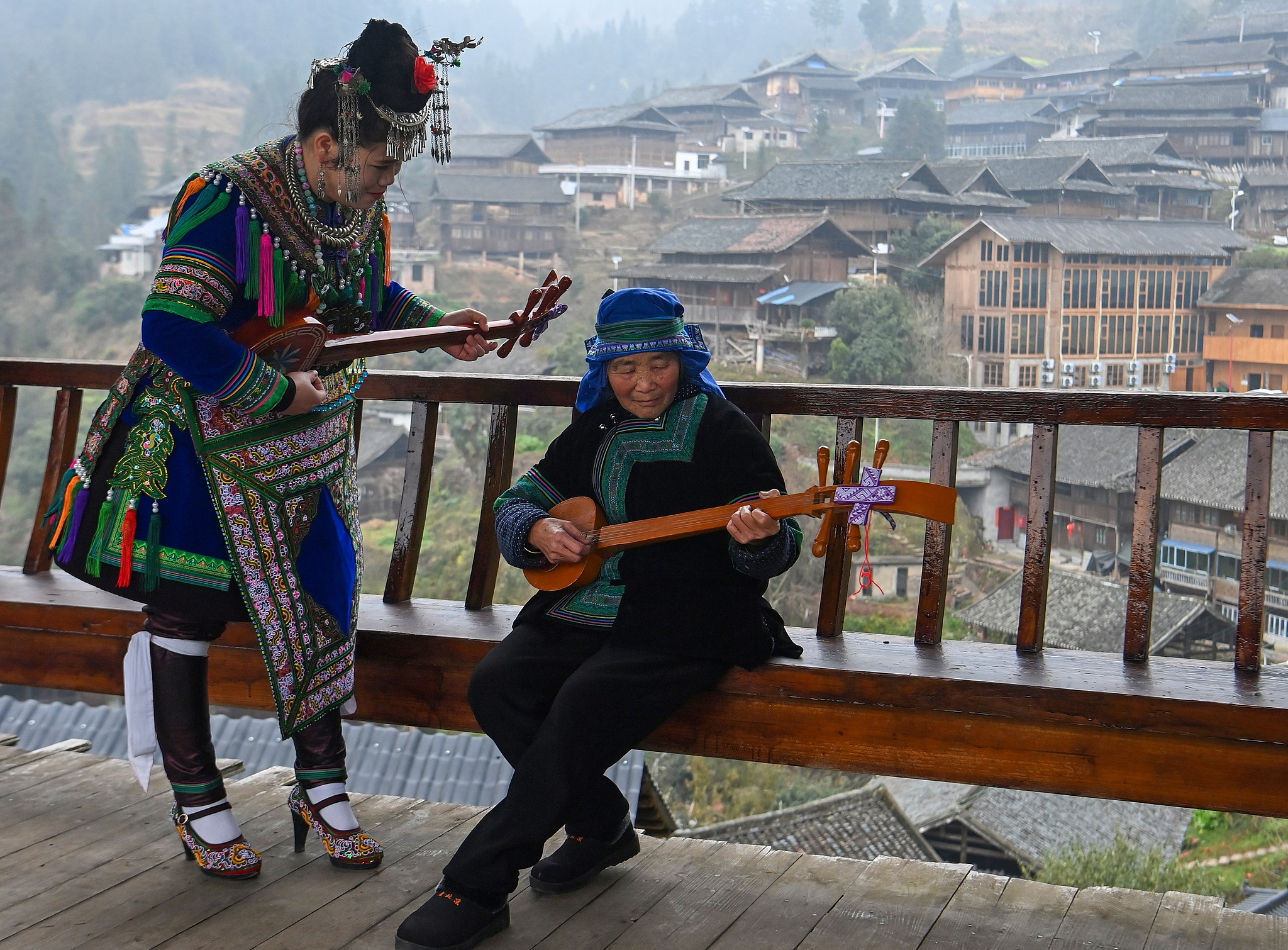 People from the Dong ethnic group perform a pipa song at Wanzhai Village in Rongjiang County, Guizhou Province, February 24, 2025. /VCG