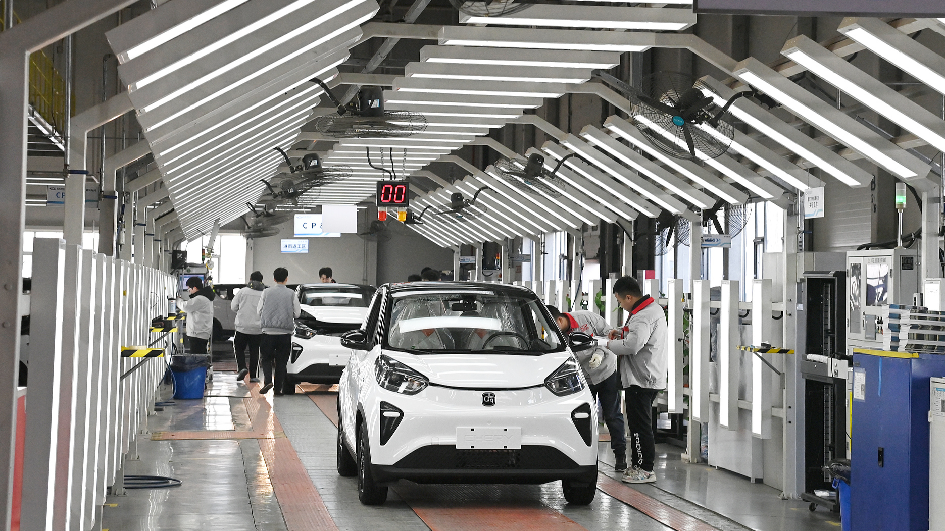 Workers at a new energy vehicle production workshop in Shijiazhuang City, north China's Hebei Province, February 25, 2025. /VCG
